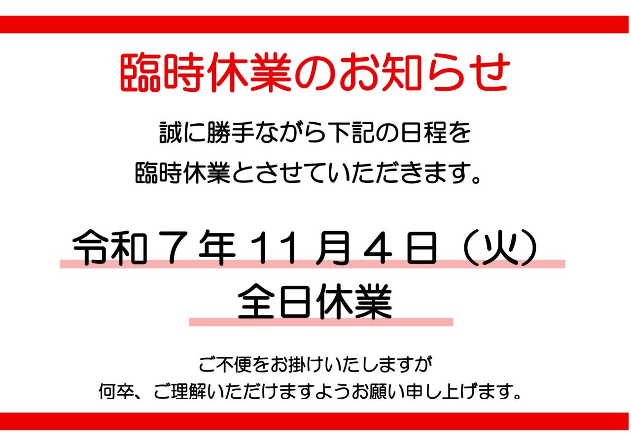 > 令和7年11月4日(火) 臨時休業のお知らせ